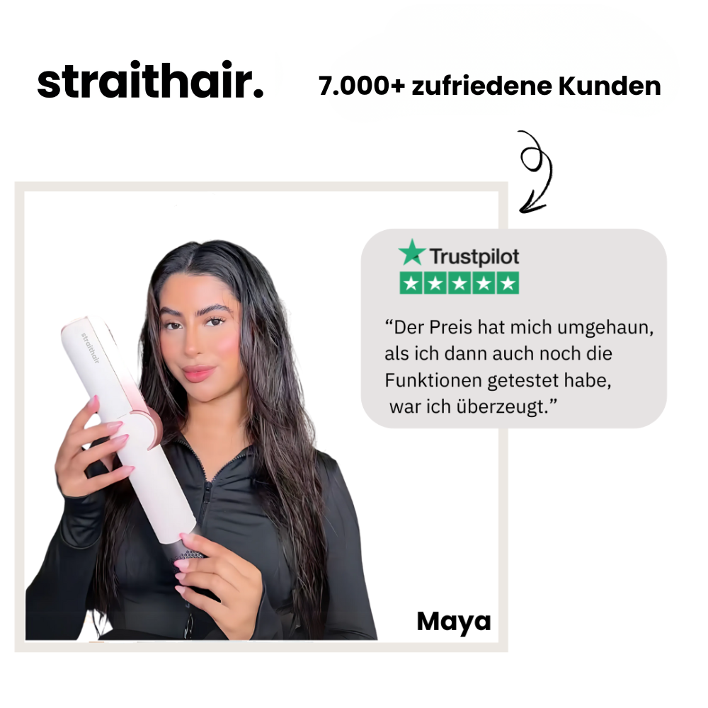 Die Stylingzeit hängt von der Haarlänge und -dichte ab, aber der Straithair ist so konzipiert, dass er das Haar effizient trocknet und glättet, wodurch die gesamte Stylingdauer verkürzt wird.